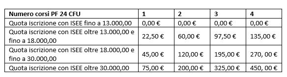 - LAUREATI versano una contribuzione massima di 500 euro + 16 di marca da bollo per tutti i 24 cfu. La prima rata è composta dalla marca da bollo e da 50 euro di contribuzione. La seconda rata è graduata in base al numero di corsi ed eventualmente in base al valore Isee inviato entro la scadenza prevista.